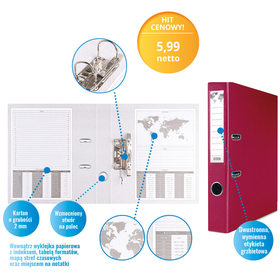 Ekonomiczny i praktyczny segregator to doskonałe rozwiązanie do przechowywania i porządkowania dokumentów w biurze oraz w domu. Wykonany z trwałego kartonu o grubości 2 mm, pokrytego jednostronnie matową folią PP, zapewnia długą żywotność i odporność na uszkodzenia.