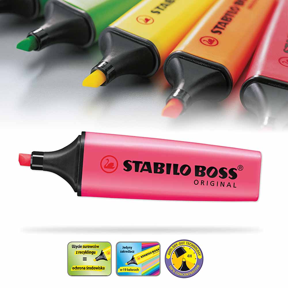 STABILO BOSS ORIGINAL dba o środowisko - wszystkie czarne elementy zakreślacza wykonane są z plastiku pochodzącego z recyklingu. Zakreślacz jest również łatwy do ponownego napełnienia, co redukuje ilość odpadów.