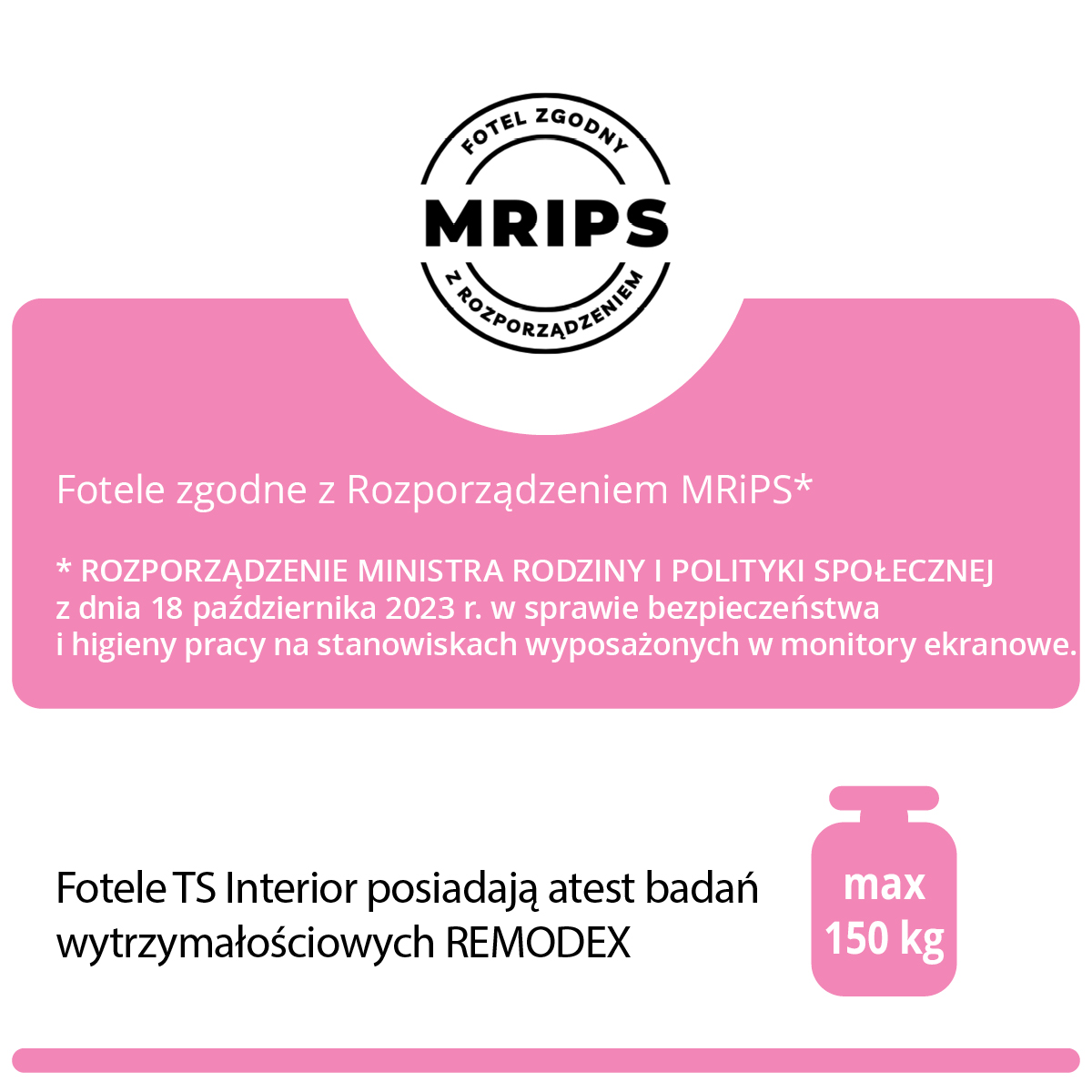 Fotel spełnia wymagania Rozporządzenia MRiPS, co czyni go doskonałym wyborem dla osób pracujących przy komputerze, dbających o ergonomię i zdrowie kręgosłupa.